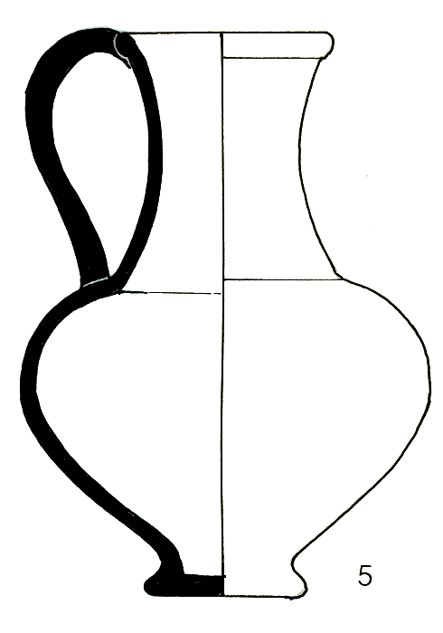 base étirée puis élargie, assise plane ; anse s'attachant sur la lèvre et sur le haut de la panse ;