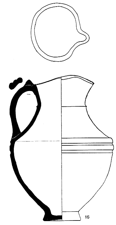 base étirée, assise tournée ; anse s'attachant sur la lèvre et sur le haut de la panse ; bec tréflé ;